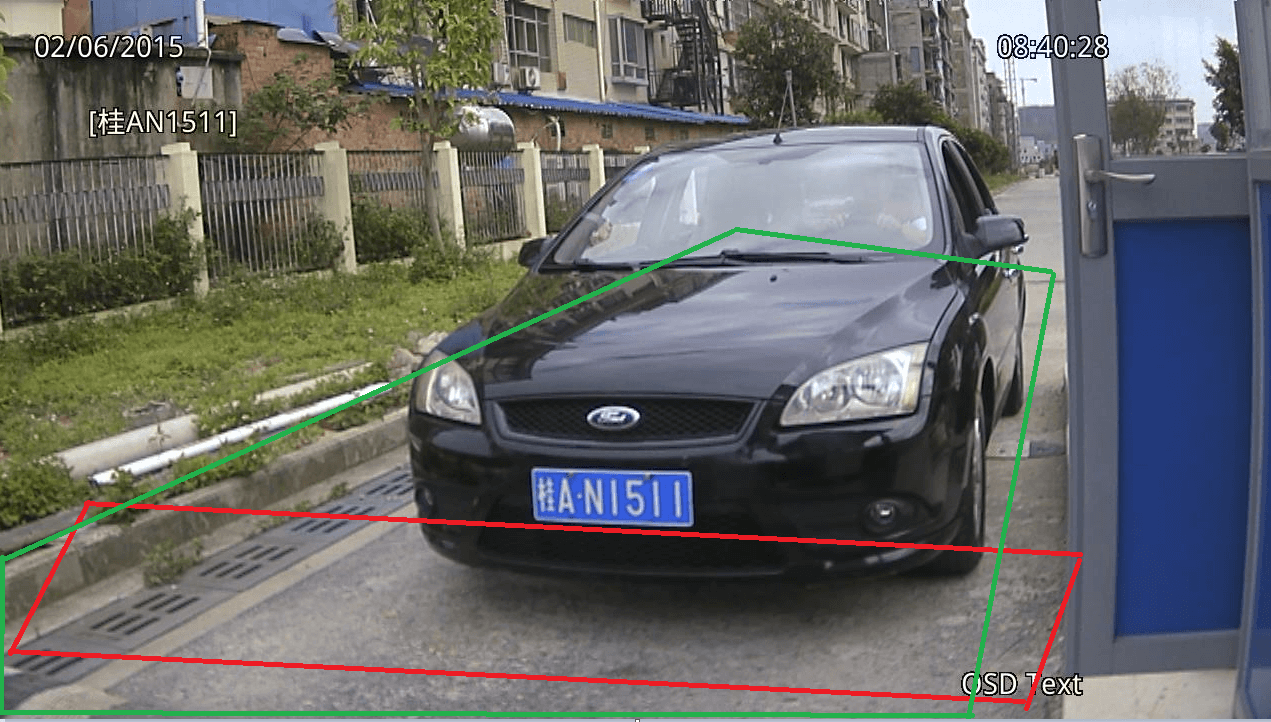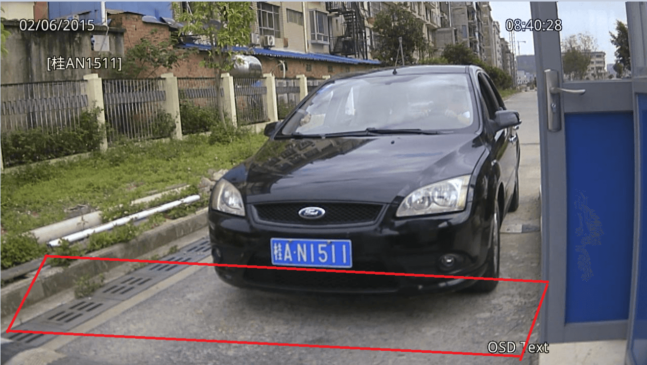 識別區(qū)域要把車牌在畫面上的有效運動范圍都包含進來. 注意:所有現(xiàn)場都必須畫上識別區(qū)域! 如圖: