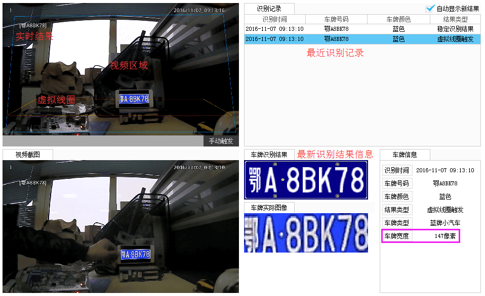 注意觀察虛擬線圈觸發(fā)的識別結(jié)果,車牌寬度值是否介于140-160之間.