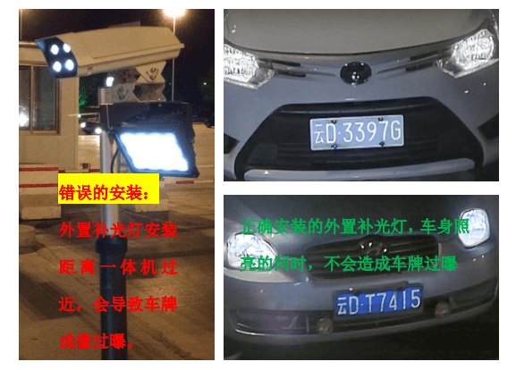 外置補光燈推薦采用白色LED補光燈,20~30W,聚光性質(zhì). 安裝高度要和攝像機保持在0.5米~0.7米的距離,外置補光燈的亮斑直接打在車牌或者車牌偏下一點,可以根據(jù)車牌過曝情況 做微調(diào),比如攝像機離地面高度1.6米,補光燈裝在同一根立柱0.9米~1.1米高; 注意:特別需要避免與以下外置補光燈錯誤的安裝情形: 外置補光燈與攝像機的安裝距離過近,如下圖,兩者的安裝距離小于30cm,補光燈的光線會直接被車牌表面的反光涂層反射 到鏡頭,導(dǎo)致車牌在視頻圖像中過曝,顯得發(fā)白,影響 終的識別效果.